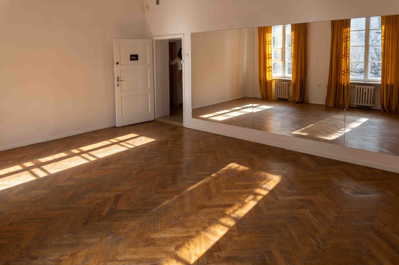 Sala o powierzchni 30 mkw. wyposażona w ścianę luster, parkiet do tańca oraz głośnik. Idealna do kameralnych zajęć ruchowych, tanecznych oraz warsztatów grupowych.